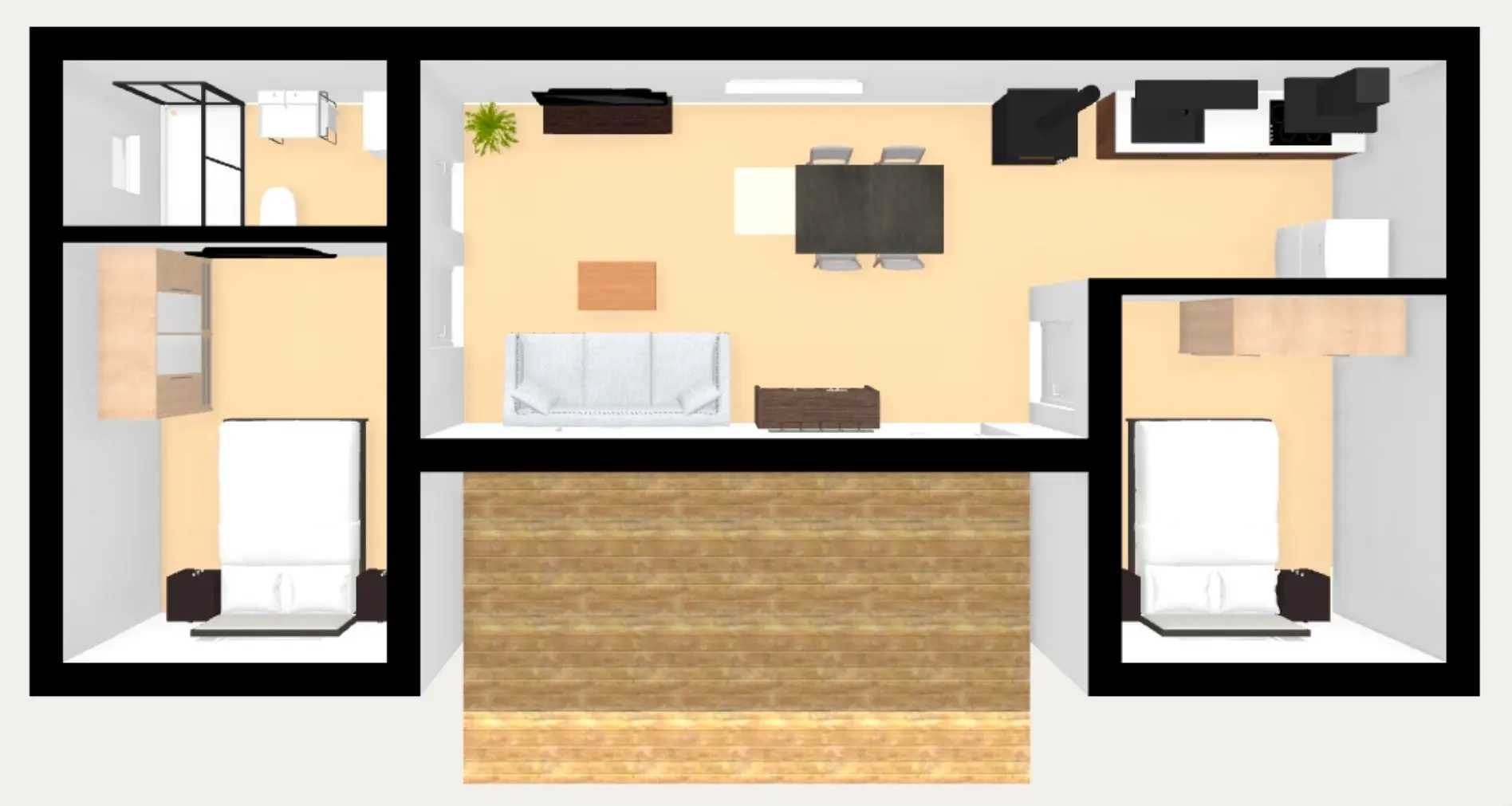Model Atria svojim jedinstvenim U-tlocrtom redefinira pojam privatnosti na 66m2. Arhitektura kuće osmišljena je u tri zone: dva bočna krila u kojima su smještene spavaće sobe za miran san, te središnji volumen s otvorenim prostorom kuhinje, blagovaonice i dnevnog boravka koji spaja cijelu obitelj. ​Ovakav "zagrljeni" oblik kuće nije slučajan – istureni blokovi spavaćih soba prirodno štite središnju terasu od vjetra i znatiželjnih pogleda, stvarajući intiman vanjski atrij koji postaje produžetak vašeg dnevnog boravka. Dok unutrašnjost nudi pametno iskorišten svaki kvadrat s kupaonicom i open-space zonom, vanjština oduševljava bogatim krovom od crijepa u mediteranskom stilu i autentičnom kamenom fasadom koja skriva vrhunsku STIROTON izolaciju. Atria je dom koji vas čuva – idealan za obitelji koje žele toplinu zajedništva, ali i svoj mirni kutak.
